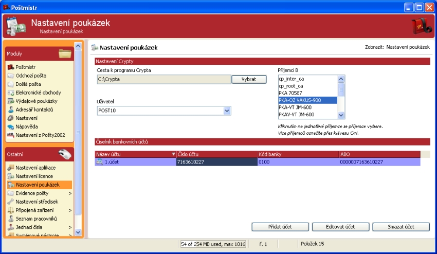 Podstatné pro šifrování přímo z programu (tj. vytvoříte rovnou zašifrovaný soubor s předepsanými parametry i názvem) je nastavit cestu k programu Crypta, platného uživatele (certifikát odesílatele – zde POST10) a příjemce (certifikát České pošty jako příjemce – zde PKB-OZ VAKUS-900).